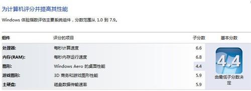 基礎性能測試,我們來看一下預裝的32位版windows7 Home Basic操作系統(tǒng)給出的分數(shù)。體驗索引結(jié)果為,處理器6.6分,內(nèi)存6.8分,圖形和游戲圖形兩項分別為4.4分和5.9分,硬盤為5.9分,得分超過主流中端商務筆記本。