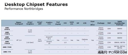 890FX除了芯片封裝尺寸和TDP之外與790FX的主要差別并不明顯,要說最大的區(qū)別可能就是跟890GX一樣,將取消對AM3以下規(guī)格處理器的支持,也就是明確只支持DDR3內(nèi)存。