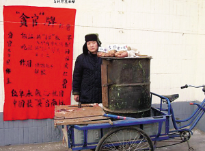 不過(guò),最引人注目的還是貼在賣(mài)紅薯者身后“紅色大字報(bào)”。在大字報(bào)上,賣(mài)紅薯者稱(chēng)自己的紅薯為“貪官牌”,并分別介紹該品牌紅薯的做法、食法和作用!皠兤淦ぃ持;填飽肚子,解恨!”“大字報(bào)”上如此描述紅薯的食法和作用,獲得了網(wǎng)友們的稱(chēng)贊。除此之外,賣(mài)紅薯者還稱(chēng)自己的紅薯是中國(guó)最“臭”名商標(biāo)。