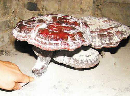 赤靈芝民間稱靈芝草。多孔菌科,是一種藥用真菌。外形頗似一株五彩蘑菇,“蘑菇蓋”呈不規(guī)則云朵形,有環(huán)紋與輻射狀的皺紋相穿插;“蓋”的下面有眾多的細(xì)密菌管孔洞;梗側(cè)生于“蓋”下,光澤如漆。每逢夏季,泰山氣溫漸高,林間相對(duì)濕度逐漸增大,陽光散射,形成泰山靈芝迅速生長(zhǎng)的有利條件。秋末,可在柞、楓朽木樁旁采到。全株入藥,有治耳聾、利關(guān)節(jié)、保神、益精氣、堅(jiān)盤骨、療虛勞、滋補(bǔ)強(qiáng)壯等功能。(徐庶)