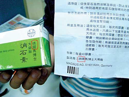 17日上午,記者看到“消石素”的藥盒上寫有“德國馬博士大藥廠”字樣,而說明書上標的制造商,卻是“西德馬博士大藥廠”。就是“德國”與“西德”這點差別,讓李先生對藥品的真實性產(chǎn)生了懷疑。李先生認為,東德與西德早就統(tǒng)一,哪里既有德國,又有西德呢?