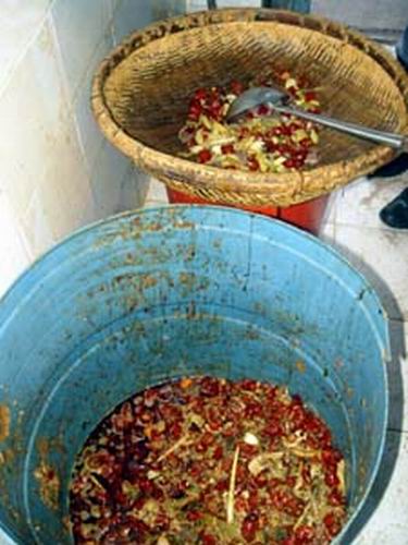 昨日下午,記者以顧客的身份來到該火鍋店,無意中在洗刷間看到,里面排放著2只一大一小臟兮兮的潲水桶。記者走近一看,發(fā)現(xiàn)大桶里有很多剩菜,包括暗紅的辣椒、蔬菜、鴨血、餐巾紙、煙頭、筷子等各種雜物。旁邊的一個小桶上擱著一個竹筐和一把勺,筐中已經(jīng)盛了許多辣椒和大蒜等剩菜。記者詢問一名進來端盤子的服務員,撈起這些剩菜做什么用途時,對方稱老板規(guī)定,客人吃剩的菜不能隨便倒,還可以用。但該服務員很快就意識到說漏了嘴,立即問記者進洗刷間做什么。記者再問,對方三緘其口。