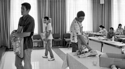第一項(xiàng)體驗(yàn)內(nèi)容是“呼吸法”,幾名“孕婦”都做得挺認(rèn)真,他們滑稽的樣子,惹得正在學(xué)習(xí)孕產(chǎn)婦保健的其他10多個(gè)準(zhǔn)爸爸們捧腹大笑。