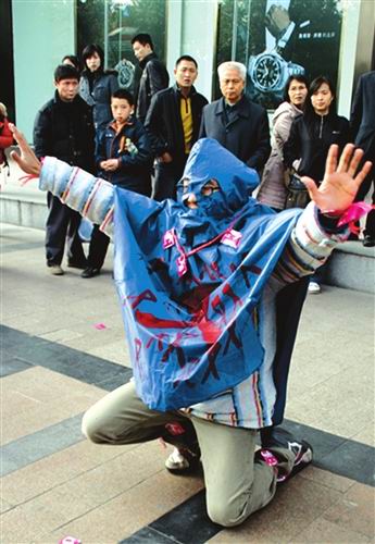 行李袋往地上一撂,佟鑫扯出藍雨衣麻利地往身上一套,變身成“超人”:只露出眼睛和嘴巴。接著,他開始走“貓步”,每往前邁出一步,就從兜里掏出安全套扔在地上,在地上擺出了“又”字。然后,他突然走近電視臺攝像機,劈開馬步,一邊對著鏡頭揮舞雙手,一邊用英文念著:“Stopaids……”兩名逛街的“老外”也被吸引過來,看到雨衣上的圖案,立即會意。其中一人撿起一個安全套,連聲稱贊“Good!”