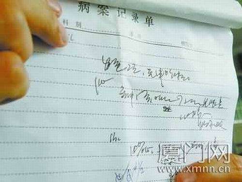 1日下午,在市內(nèi)某大醫(yī)院的兒科候診區(qū),記者隨手向一名帶孩子前來復診的家長借了份病歷,一看就懵了:除了“09.2.1”的日期和表示藥物劑量的幾個阿拉伯數(shù)字能看清,其他字跡根本無法辨認!搬t(yī)生寫字都是這樣。”這位家長說,他從來就不去看病歷,看了也看不懂。
