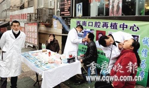 記者立刻前往調(diào)查,發(fā)現(xiàn)這三名中年男子身著白大褂,白大褂上印有“重醫(yī)大附二院”等字樣,面前的一張桌子上,擺滿了假牙、醫(yī)藥棉花和一些瓶瓶罐罐及資料。“我們都是大醫(yī)院的醫(yī)生,周末出來治病兼宣傳!币娨恢心昴凶訙惿蟻,著白大褂的一男子立即熱情招呼,隨即拿起手術鉗就往患者口腔里插。