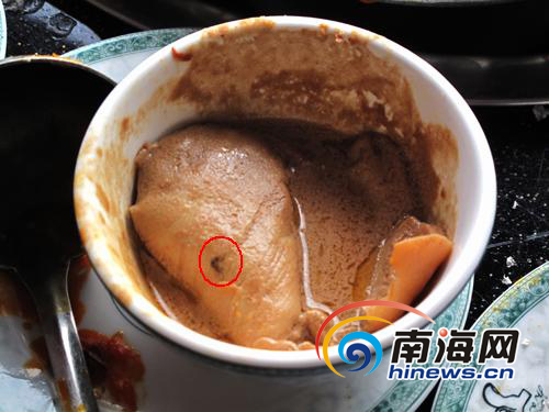 據(jù)周先生介紹,當(dāng)天下午1時(shí)許,他和朋友4人來(lái)到大英路重慶劉一手火鍋吃飯,這頓飯一共消費(fèi)了160元。但是在吃飯的過(guò)程中,他們首先發(fā)現(xiàn)鍋里有一根類似頭發(fā)的東西,然后他們叫該店負(fù)責(zé)人來(lái)查看,該負(fù)責(zé)人看后對(duì)他們表示歉意,他們就姑且不追究。