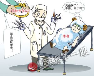 “下月起,醫(yī)院再對患者進行過度檢查屬于違法!敝貞c合縱律師事務所徐桂鵬律師介紹,《侵權責任法》7月1日起正式施行,該法對過度檢查作了明確禁止性規(guī)定。