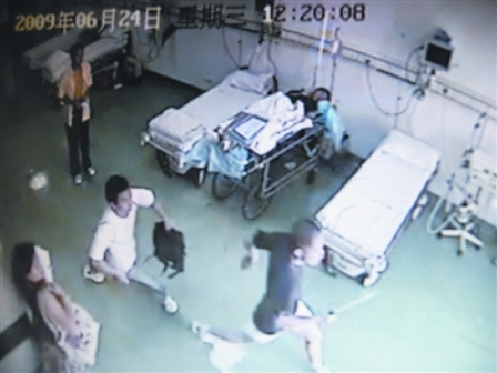 監(jiān)控錄像中顯示:一名光頭男子逃進(jìn)搶救室,兩名男子持刀一路追砍(見圖),在搶救室一角將其砍成血人才罷休。行兇幾分鐘后,6名砍人兇徒從容走出醫(yī)院,沿香江花園路口向三眼橋方向逃走。傷者隨即被送進(jìn)十一醫(yī)院手術(shù)室,搶救后一人傷勢嚴(yán)重被轉(zhuǎn)往協(xié)和醫(yī)院治療。