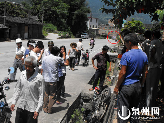 記者昨日上午10時趕到位于永春達(dá)埔鎮(zhèn)東園村委會附近的事發(fā)現(xiàn)場時,警方仍在現(xiàn)場勘察。據(jù)了解,死者張某泉今年38歲,家住在距東園村五六公里遠(yuǎn)的錢峰村!叭颂稍谶@個地方,摩托車卻翻倒在100多米外的水溝里!睆埬橙囊晃挥H戚指著路對面的涼棚告訴記者,張某泉的遺體就停放在那里。