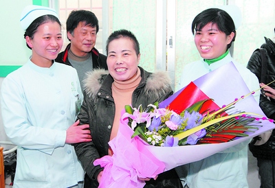 3月2日上午,已將一頭長卷發(fā)剪成寸頭的吳澤連由丈夫陪著坐在病床前的凳子上。此時的她滿面笑容,臉上還帶著一絲紅潤。入院66天來,在眾多親友都認為“沒得救了”的情況下,她硬是從“鬼門關”被拉了回來。