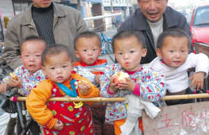 昨日上午,河南鄭密路與淮河路交會處農(nóng)貿(mào)市場門口,約一歲半的五胞胎繞著一輛小推車嬉笑打鬧,吸引路人紛紛駐足。三男二女,名叫貝貝、晶晶、歡歡、迎迎和妮妮,與奧運吉祥物五福娃同名。
