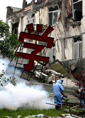 5月18日,防疫人員在映秀鎮(zhèn)一處學(xué)校的廢墟上噴灑消毒水。