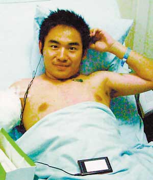 21日凌晨麻醉劑的藥效過(guò)去后,廖波疼痛難忍,為了不影響同室兩名病友休息,他咬著毛巾和筷子堅(jiān)持著,最后把一雙筷子都咬斷了也沒(méi)呻吟一聲。目前,他的病情已趨于穩(wěn)定,但可能還需要再次手術(shù)。住院期間,廖波還認(rèn)了一名志愿者做干媽!八龑(duì)我特別好,是第一個(gè)幫我擦身子、換衣服的人!绷尾ê俺觥皨尅钡臅r(shí)候,志愿者頓時(shí)泣不成聲,把廖波擁在了懷里。