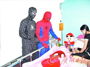 昨日上午9時30分許,在汕頭大學(xué)第一附屬醫(yī)院北樓三層的兒科病房的走廊上,突然出現(xiàn)了兩個與周圍環(huán)境不太相襯的角色,立刻引起了一陣不小的轟動!皟蓚男的,一個穿紅衣服,一個穿黑衣服,都蒙著臉。”兒科病房42床上的小患者母親黃海璇回憶當(dāng)時的情景,這兩個人的裝扮就和電影里的“蜘蛛俠”一模一樣,徑直來到了她眼前,然后把蜘蛛俠玩具放到了病床上。