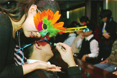 參加者都用眼罩蒙住眼睛,再戴上面具。然后,屋里關(guān)燈,每個(gè)人仔細(xì)甄別異性散發(fā)出來(lái)的氣味。如果女士找到屬于自己味道的男士,就可以輕拍他三下,邀請(qǐng)其參加接下來(lái)的活動(dòng)。雙方蒙眼參加“心有靈犀”、“危情應(yīng)對(duì)”等一系列的活動(dòng)之后,選定情侶并將定情鎖送給對(duì)方作為信物。