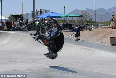 現(xiàn)年16歲的亞倫·佛斯靈漢姆(Aaron Fotheringham)被朋友們稱作“車輪” 。1991年11月出生在美國內(nèi)華達州的拉斯維加斯的他,患有脊柱分裂的先天疾病, 從3歲起就不得不依靠輪椅生活。但是,他卻成為了輪椅上完成后空翻高難度動作的第一人(目前唯一的一個),他也因這一壯舉在2008年10月入選了吉尼斯世界紀(jì)錄。