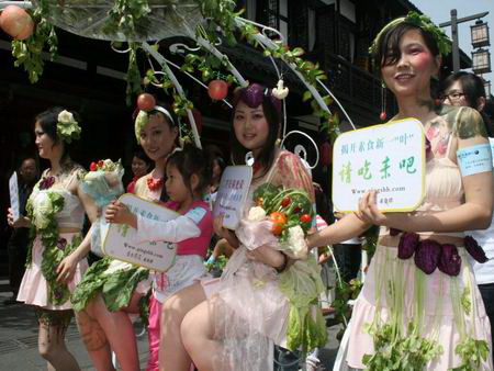 當(dāng)天正值第四十個(gè)世界地球日,成都文殊坊街上人流熙攘。這幫身披菜葉的年輕漂亮女子馬上就成為行人注目的焦點(diǎn),“喲,遠(yuǎn)看就只掛了些菜葉子在身上,原來(lái)還是穿了點(diǎn)紗的嘛,是不是又在搞什么商業(yè)活動(dòng)哦?”四川新聞網(wǎng)記者在現(xiàn)場(chǎng)看到,雖然沒怎么搞清楚狀況,但不少市民已經(jīng)掏出手機(jī)來(lái)開始拍照。得知是群素食主義者的宣傳活動(dòng)后不少市民都打趣稱,“用穿得少的美女上街當(dāng)噱頭,肯定要轟動(dòng)。”