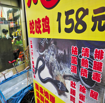 “打死我都不敢吃!”市民劉先生在黃泥塝看到某餐館推出的“蛇咬雞”招牌后說,這些吃法太怪了。劉先生介紹,招牌上還說,吃“蛇咬雞”可以醒腦、除雀斑、排臟毒、祛風(fēng)濕等!斑@不僅太殘忍,太血腥,也不道德!睆埮空f,希望這僅僅是個(gè)別餐館吸引顧客而搞的噱頭。