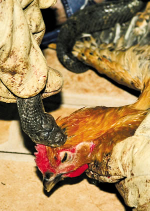 男廚師隨即將這條眼鏡蛇放回籠中,順手拿出一條稍大的眼鏡蛇!芭、啪、啪!”男廚師再次拍打它的頭部,并將母雞靠近其芯子“誘惑”它。