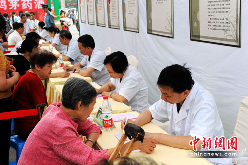記者在現(xiàn)場看到,文化節(jié)分設了義診區(qū)、文藝表演區(qū)、展覽區(qū)和咨詢區(qū),除了傳統(tǒng)中藥材、保健品展示外,還將在活動期間現(xiàn)場免費發(fā)放萬袋解暑良藥。整個活動中尤以中醫(yī)專家現(xiàn)場義診區(qū)最為“火爆”, 不少聞訊而至的市民一大早即在展位前列隊等候,到了中午,各展位前等待問診者仍是絡繹不絕。其中不僅有注重養(yǎng)生健體的中老年人,亦吸引了不少為健康減肥、樂于食療的年輕人駐足。而在活動現(xiàn)場的大型圖片展板上,還詳細列舉各類食療養(yǎng)生的配方與原理,配合四季介紹了強身、美容的養(yǎng)生茶,吸引了各個年齡段的人士觀看、解讀與摘抄。