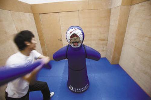 一個(gè)18平米左右的房間,墻壁四周貼著各種人物造型,房間里到處是氣墊和拳擊手套,一個(gè)高約兩米的充氣假人,笑容可掬地等著挨揍!