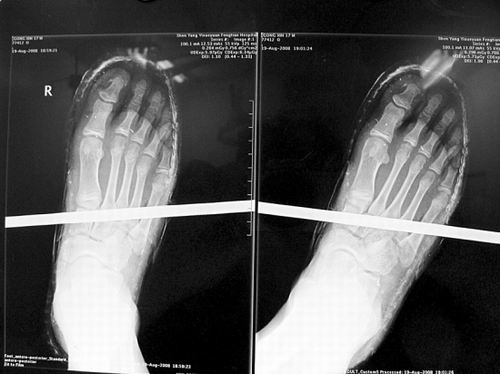 事發(fā)時(shí)男孩穿著一雙布鞋,骨外二科陳賓醫(yī)生操起剪刀,將布鞋一塊塊剪掉。經(jīng)X光透視,醫(yī)生驚奇地發(fā)現(xiàn):男孩雖然被鋼筋穿透了右腳,但骨頭、大的血管和神經(jīng)都沒受任何傷害!