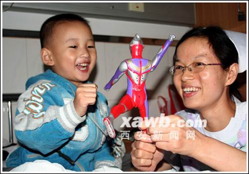 圖為手術(shù)前醫(yī)護(hù)人員在逗郎錚開心。