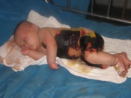 昨日(12月30日),記者在187醫(yī)院燒傷科307房看到,男嬰黃堂國(guó)躺在床上,前胸、右腿和臀部等被嚴(yán)重燙傷,燙傷處被涂上了厚厚的藥膏。黃堂國(guó)的父母在病床前不停嘆息,“因借不到錢(qián),現(xiàn)在醫(yī)院已經(jīng)停止對(duì)孩子用藥了!秉S堂國(guó)的母親告訴記者,她家住海口市龍華區(qū)遵譚鎮(zhèn)群力村委會(huì)美萬(wàn)村。12月19日晚,她正準(zhǔn)備給孩子洗澡,當(dāng)時(shí)先往盆里放熱水,正想放冷水時(shí)忽然想起忘了給孩子拿衣服,就在她出去拿衣服時(shí),孩子不慎掉進(jìn)了熱水盆,“當(dāng)時(shí)孩子被燙得哇哇直哭”。