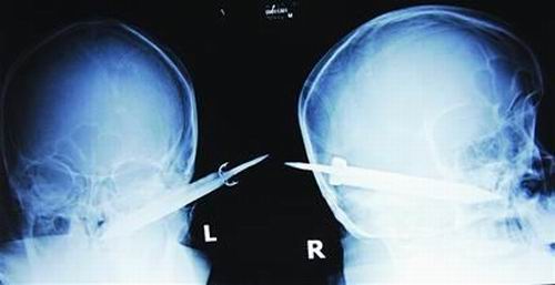 經(jīng)過檢查,醫(yī)生說這把長有10厘米左右的刀,從右耳窩上前方直接刺進(jìn)了鼻腔,離頜內(nèi)大動(dòng)脈很近,刀卡在了骨頭中,要取出這把刀最怕大出血,萬幸的是這把三棱刀并沒有傷及大腦。