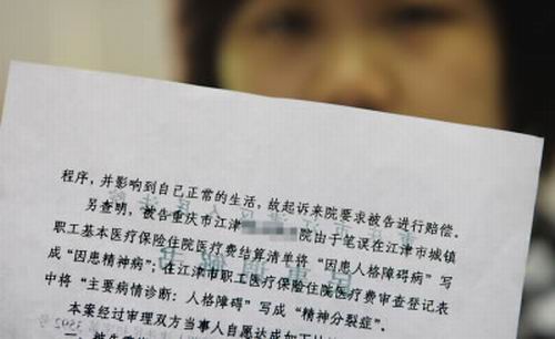 昨日,小玫趕到重慶向記者出示了調解書。法院查明,當初醫(yī)院在小玫醫(yī)保住院醫(yī)療費結算清單中將“因患人格障礙病”寫成“因患精神病”和在“職工醫(yī)保費用審查登記表”病情診斷一欄中將“人格障礙”寫成了“精神分裂癥”,都是筆誤。經(jīng)過調解,醫(yī)院愿意將上述兩處“筆誤”改過來,即把精神病的鑒定刪去,不過依然保留對患者有“人格障礙”的結論。小玫說作為調解的條件,她放棄了6萬元的索賠請求。