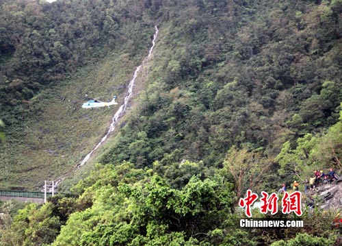 10月22日,臺(tái)灣“交通部觀光局”晚間表示,23日將以直升機(jī)救出停留在蘇花公路受災(zāi)處過夜,除仍失聯(lián)者外的全部14名大陸游客。圖為22日,臺(tái)灣救援直升機(jī)在受災(zāi)現(xiàn)場(chǎng)運(yùn)送游客脫險(xiǎn)。