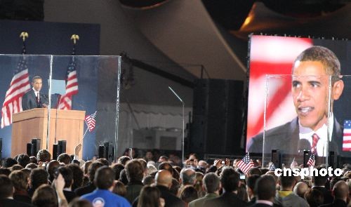 圖為奧巴馬當(dāng)晚在芝加哥出席慶祝晚會上以“美國的變革”為主題發(fā)表獲勝演說,稱“美國的變革時代已到來”。