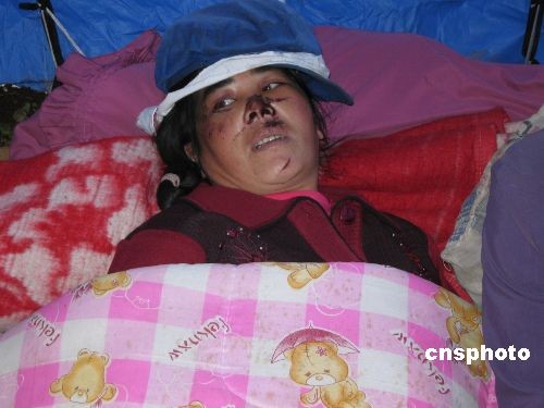 圖為村民王光蘭在被埋五個多小時被村干部救出,被醫(yī)護人員治療后在救災(zāi)帳篷中休息。中新社發(fā) 劉子倩 攝
