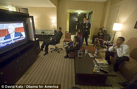 奧巴馬在芝加哥賓館的一個(gè)房間里的大屏幕電視收看他的對手、共和黨總統(tǒng)候選人麥凱恩發(fā)表承認(rèn)落選講演時(shí)看起來很嚴(yán)肅,他好像處于思考狀態(tài),這很符合他的外號(hào)“毫無戲劇效果的奧巴馬”。奧巴馬身體前傾,把雙手放在下巴下,非常關(guān)注地聽著麥凱恩的講演。