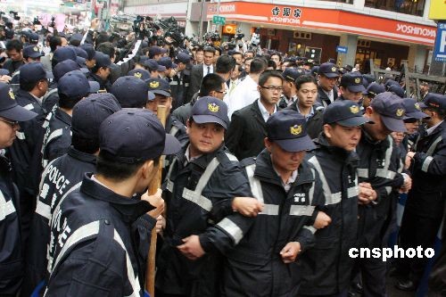 陳水扁從其辦公室步行前往不足百米遠(yuǎn)的特偵組,眾多警察在其周?chē)S持秩序,現(xiàn)場(chǎng)附近警方部署大批警力。中新社發(fā) 黃少華 攝