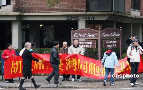 來自大華府地區(qū)數(shù)千名當(dāng)?shù)厝A僑華人和中國(guó)留學(xué)生,11月14日手拉橫幅準(zhǔn)備迎接參加20國(guó)集團(tuán)金融峰會(huì)的中國(guó)國(guó)家主席胡錦濤。