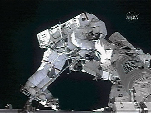 在長達(dá)6小時45分鐘的太空行走中,“奮進”號任務(wù)專家海德瑪麗·斯特凡尼斯海寧-皮珀和沙恩·金布羅繼續(xù)維修空間站外右側(cè)出故障的太陽能電池板旋轉(zhuǎn)接頭。