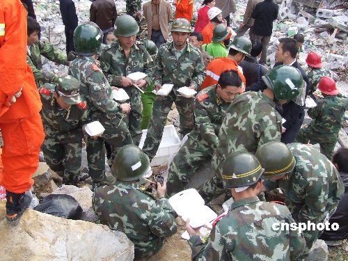 消防等救援人員匆忙進(jìn)食以繼續(xù)搜尋山崩失蹤者。中新社發(fā) 周恩革 攝