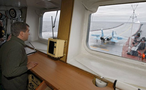 俄總統(tǒng)梅德韋杰夫在庫茲涅佐夫號航母上觀看穩(wěn)定2008軍演(資料圖)