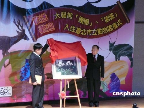 圖為歡送“團(tuán)團(tuán)”“圓圓”赴臺代表團(tuán)團(tuán)長趙學(xué)敏和臺北市長郝龍斌共同為“團(tuán)團(tuán)”“圓圓”基因檔案大幅照片揭幕。