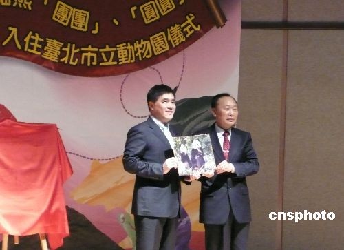 圖為歡送“團(tuán)團(tuán)”“圓圓”赴臺代表團(tuán)團(tuán)長趙學(xué)敏向臺北市長郝龍斌贈送“團(tuán)團(tuán)”“圓圓”基因檔案,象征交接正式完成。