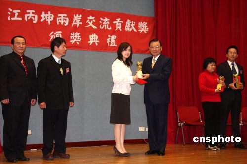 1月15日,;鶗麻L江丙坤出席“兩岸經(jīng)貿(mào)合作與交流研討會”,并頒發(fā)“江丙坤兩岸交流貢獻(xiàn)獎”。得主包括臺灣大學(xué)環(huán)境工程學(xué)研究所教授駱尚廉、夏潮基金會董事長宋東文等人。中新社發(fā) 陳立宇 攝
