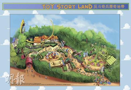 以電影《反斗奇兵3》為骨干,在區(qū)內(nèi)擺放各式超巨型玩具,旅客置身其中,如變了小矮人。區(qū)內(nèi)有3個(gè)機(jī)動(dòng)游戲:其一是賓客坐上如“臘腸狗”的設(shè)施,經(jīng)歷一段顛簸旅程;另一設(shè)施是一臺(tái)穿梭飛車(chē),接載賓客沿高達(dá)數(shù)十呎的U形軌道快速來(lái)回;最后是一個(gè)“跳傘”訓(xùn)練旅程,賓客可因應(yīng)喜好,調(diào)校從25米高臺(tái)向下急墜的速度。