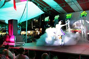 七月歌臺的燈光璀璨奪目,一身閃耀裝扮的歌手落力地勁歌熱舞,臺下觀眾有些閑坐在椅子上觀賞,更多是站在一旁湊熱鬧聽歌的。只見有個(gè)身影穿梭在喧鬧的人群中,手持著半專業(yè)型相機(jī)正在專心攝影,為歷史留下紀(jì)錄。