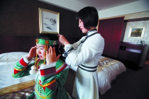 昨日,蒙古族女孩韓笑幫鄂溫克族女孩蘇玉秀綁頭飾。她們將和另外110名各族青少年一起參加國慶慶典。本報(bào)記者 孫純霞 攝