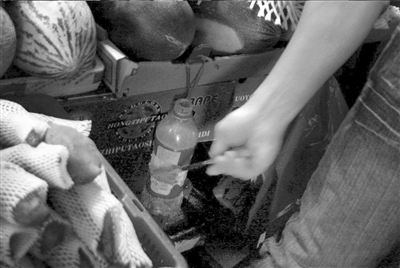 昨天,記者暗訪發(fā)現(xiàn),在四道口明光寺批發(fā)市場(chǎng)的水果大廳,一些水果攤主將水果刀浸泡在甜水里。有顧客時(shí),攤主會(huì)用水果刀切水果給顧客試吃。由于水果刀上的甜水沾到果肉上,水果吃起來(lái)會(huì)感到很甜。