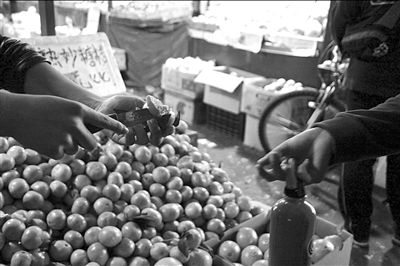 攤主用“糖水刀”切橘子給顧客嘗。 王苡萱攝