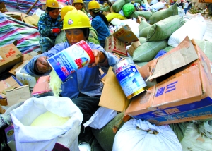 10月14日,工人將問題奶粉分揀裝袋以便銷毀。趙永輝 攝
