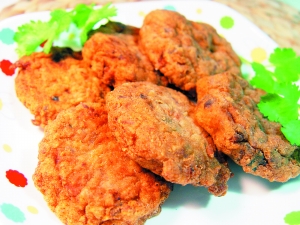 材料:鯪魚(yú)滑(230克)、紅蘿卜(1/4根)、黃彩椒(1/4只)、蔥(1根)、香炸粉(1杯)